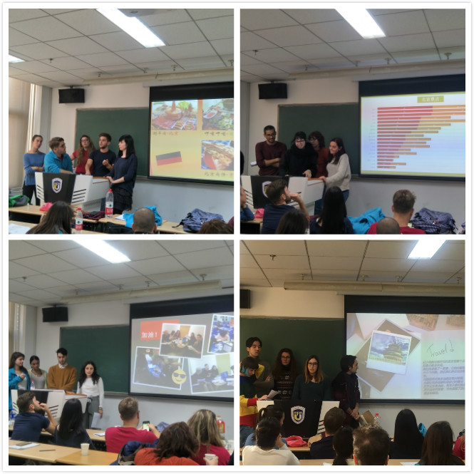 ??11月3日,罗马学生社会实践课期中报告会顺利举行。同学们通过两周的时间,在老师帮助下,从最开始的选题、设计调查问卷、进行校园内的实地调查、整理调查结果资料、制作PPT以及最后的小组发表。每组同学都竭尽全力,努力认真地做好每一个环节。报告会分别由4个组进行报告,同学们都围绕着北京的美食和北京的美景为主题来进行报告。??