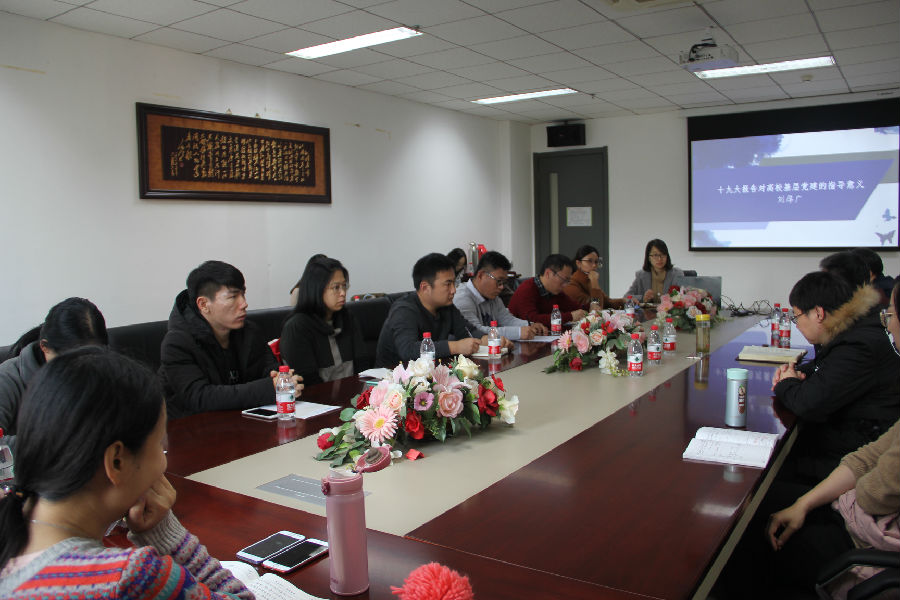 燕山大学外国语学院英语系党支部书记董哲老师介绍了学院的基本情况,重点以“深入学习十九大精神,促进党支部特色建设”为题,总结了燕山大学外国语学院通过观看十九大报告直播、发放学习读本、学习读物、学院集中学习、支部讨论、举办学习竞赛活动等多种方式学习十九大精神,取得了突出效果。