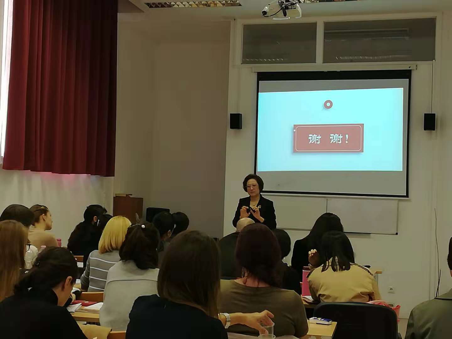 正在孔院进行评估的国家汉办师资处副处长何薇,北京师范大学贾放教授,国家汉办特邀培训专家、北京语言大学学术委员会主任、《世界汉语教学》主编张博教授,北京语言大学汉语学院党总支书记张浩教授等,全程听取了本次“产出导向法”培训,并对讲座内容与效果予以了充分肯定。