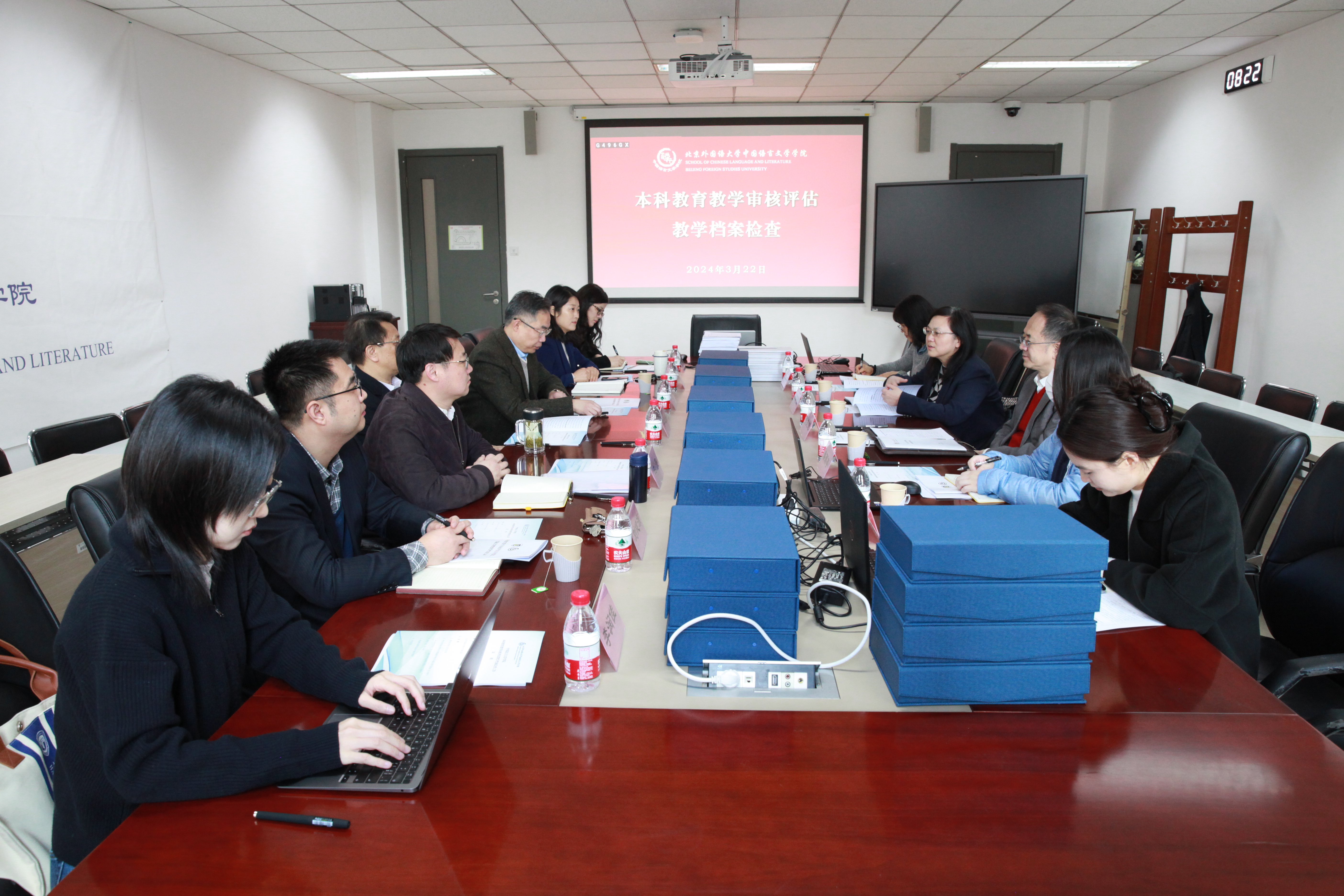 3月22日上午,学院迎接学校本科教育教学审核评估教学档案检查。学校党委副书记、副校长贾文键,教务处处长李莉文及检查组潘雨亭、魏英姿、张阔老师一行对学院审核评估工作进行督导和交流。学院党总支书记何辉、执行院长李建盛、副院长白亮、副书记曹文婷、办公室主任王慕尧、教务办公室主任刘健源、中文系秘书李润佳参加会议。