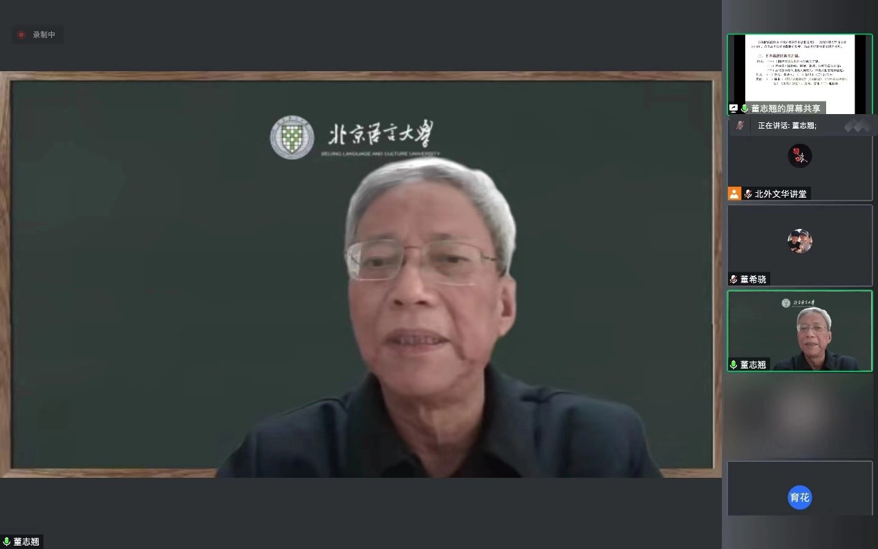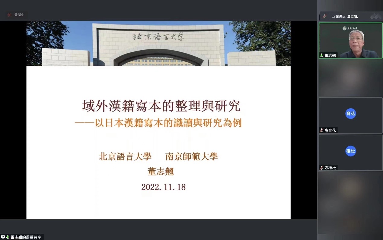 2022年11月30日,taptap点点体育taptap点点体育举办“北外文华讲堂”系列讲座,邀请国家级高等院校教学名师、北京语言大学特聘教授董志翘先生作题为《域外汉籍写本的整理与研究——以日本汉籍写本的识读与研究为例》的线上学术讲座。讲座由taptap点点体育高育花教授主持,副院长方稚松及校内外师生一百三十余人参与此次讲座。