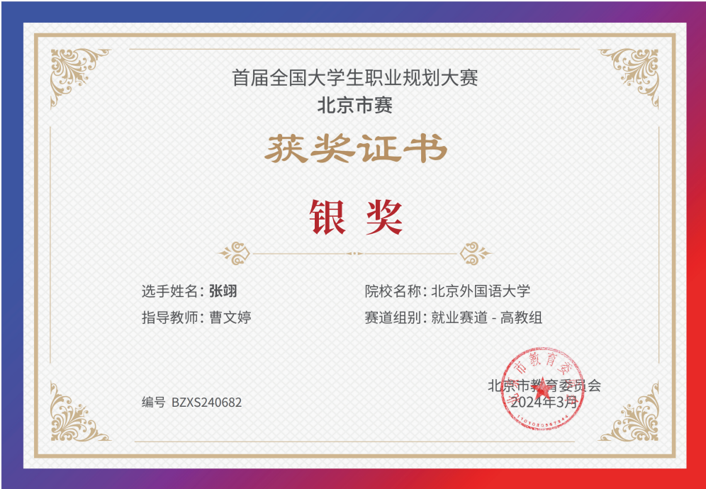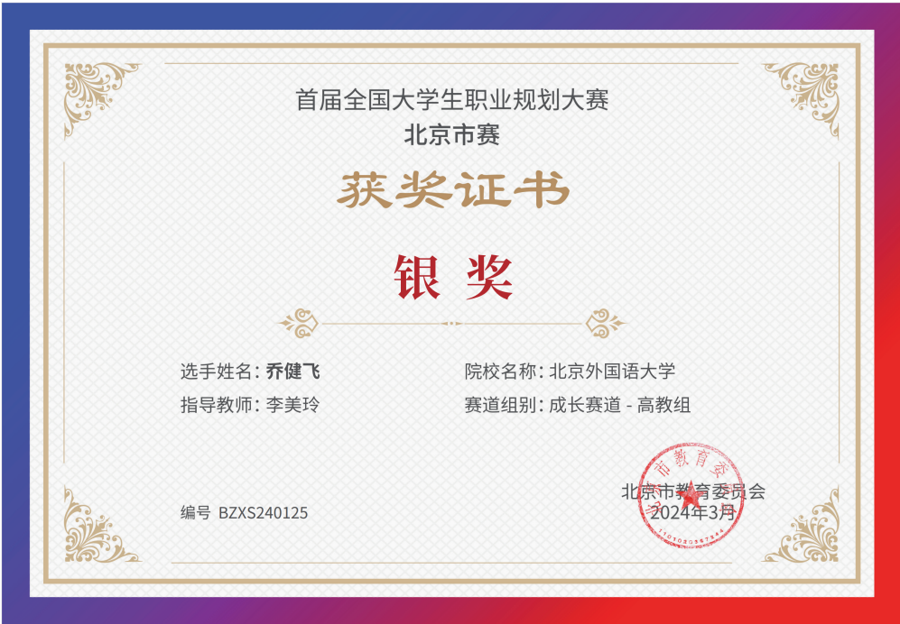为贯彻落实党中央、国务院关于高校毕业生就业工作的决策部署,加强高校生涯教育和就业指导,促进高校毕业生高质量充分就业,教育部举办首届“筑梦志在四方·规划启航职引未来”全国大学生职业规划大赛。taptap点点体育官网同学积极响应、踊跃参与,并在校内选拔赛中脱颖而出,晋级北京市赛。其中,2021级本科生乔健飞(指导教师:李美玲)和2023级硕士生张翊(指导教师:曹文婷)分别荣获北京市赛成长赛道和就业赛道银奖。