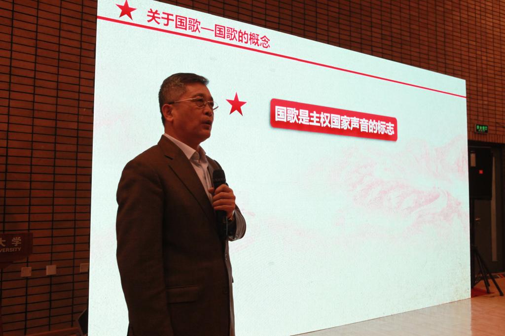 报告由《中华人民共和国国歌》的发展历程、国歌是国家神圣的象征、国歌承载厚重家国情怀、我们的国歌是世界上最好的国歌等几部分组成。于海老师指出,国旗、国徽和国歌是一个主权国家最重要的标志,国歌是国家的第一歌。我们的国歌是不屈不挠、团结奋斗民族精神的集中体现,历经时代变迁,在烽火中得到淬炼,为中国人民铭记与热爱。国歌是国家文化的结晶和历史见证,每个国家的国歌都凝聚着独特的文化内涵。国歌是公民爱国主义的载体,唱国歌和听国歌都能表达对民族和祖国的热爱。国歌具有崇高地位,受到法律保护。