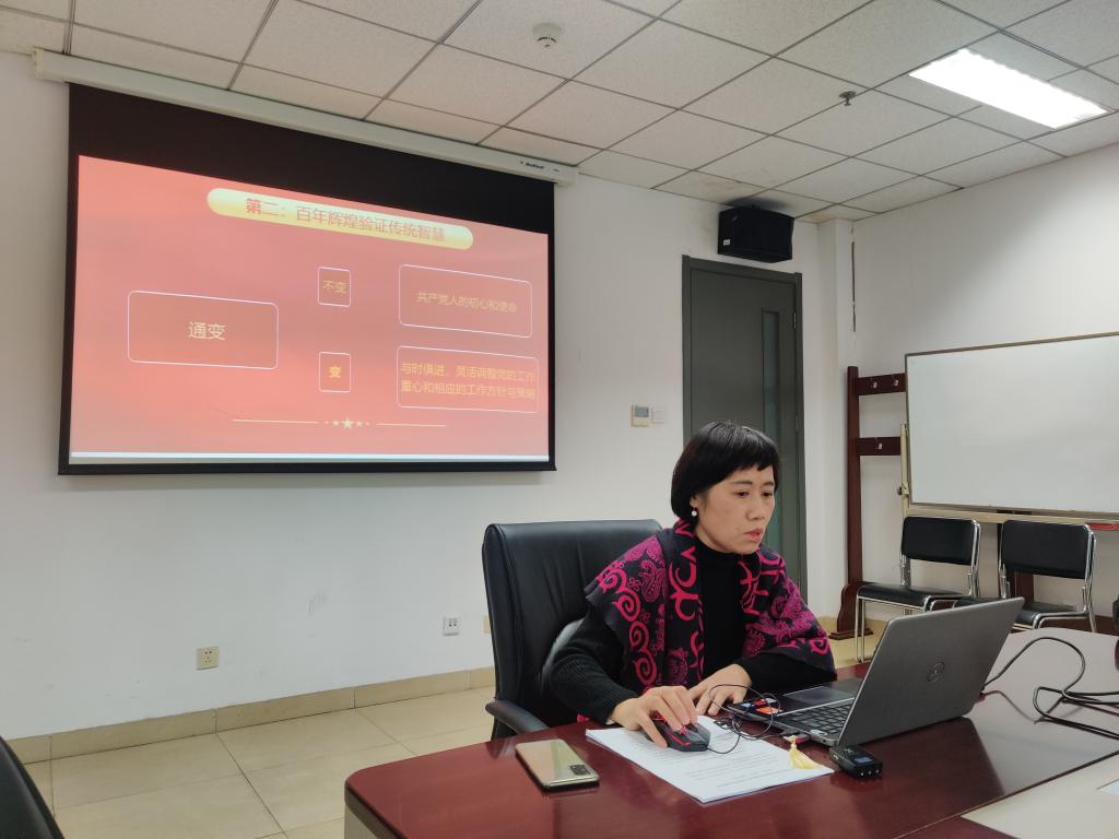 冉老师首先与大家一起重温了决议的主要内容,然后重点谈到自己对决议的理解。她认为,决议主要是回答了中国共产党过去为什么能成功和中国共产党今后怎样才能更成功这样两个问题,而这回答可以浓缩为“通”与“变”两个字,即“不变”与“变”。不变的是中国共产党人的初心和使命,而变则是指党在不同的历史时期,与时俱进,在工作重心、工作方针与策略上的灵活调整。