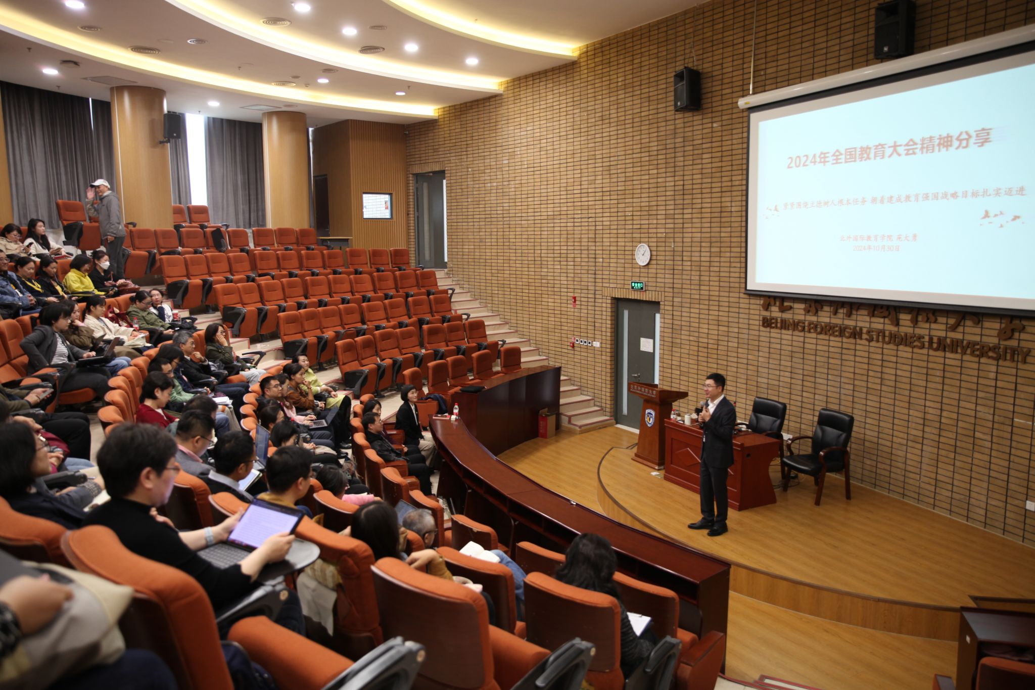 苑大勇从深刻把握教育强国的科学内涵、深入推动教育高水平对外开放、培养造就新时代高水平教师队伍三个维度回顾了大会重点内容。习近平总书记指出,我们要建成的教育强国,是中国特色社会主义教育强国,应当具有强大的思政引领力、人才竞争力、科技支撑力、民生保障力、社会协同力、国际影响力,为以中国式现代化全面推进强国建设、民族复兴伟业提供有力支撑。教育对外开放要统筹做好“引进来”和“走出去”两篇大文章,扩大国际学术交流和教育科研合作,积极参与全球教育治理。培养造就新时代高水平教师队伍,要实施教育家精神铸魂强师行动,加强师德师风建设,进一步完善中国特色教师教育体系,大力提高教师培养培训质量。最后,苑大勇对北外学科建设发展提出思考,指出要强化教育与科技、人才战略的协同发展,从个人和集体层面推动教育现代化和教育强国建设的实际措施。